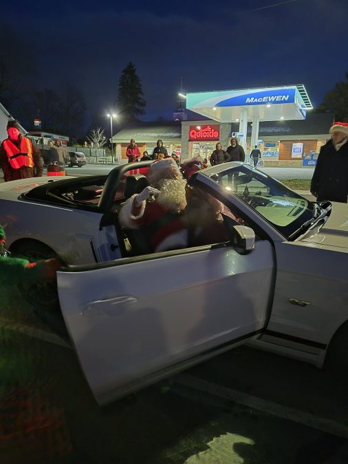 Santa Claus arrived in L’Orignal on Saturday, November 29 when residents gathered to turn on the lights on the big Christmas tree in the centre of the village. Unlike his usual transportation of a reindeer-drawn sleigh, Santa arrived in L’Orignal as a passenger in a Ford Mustang convertible with the top down.