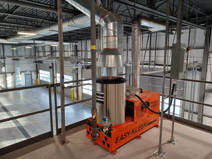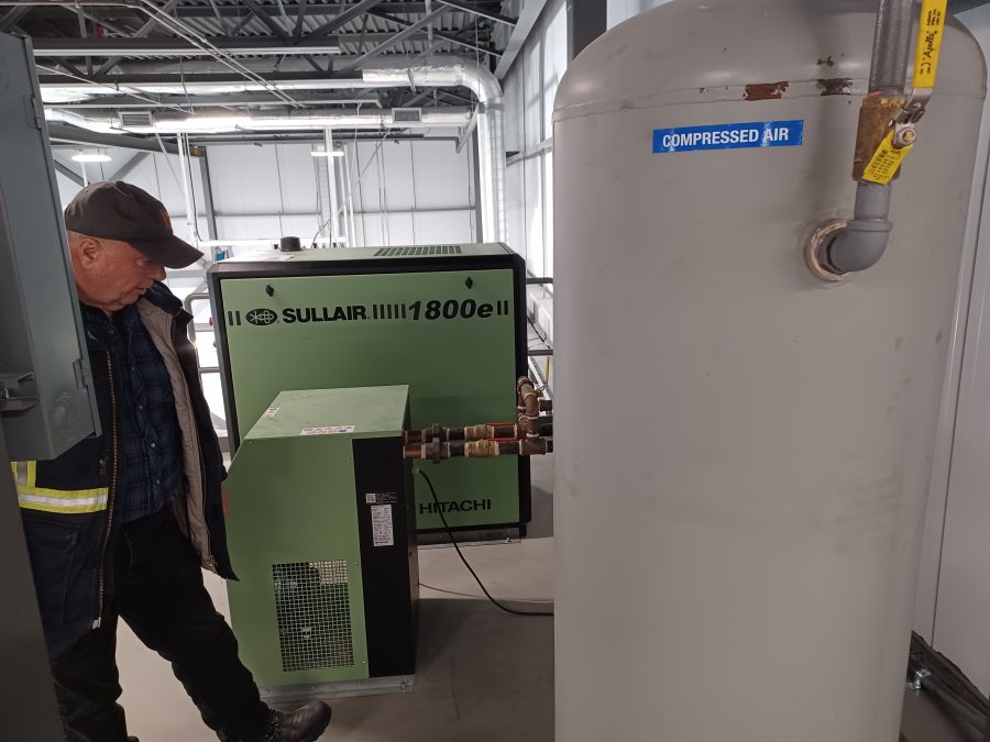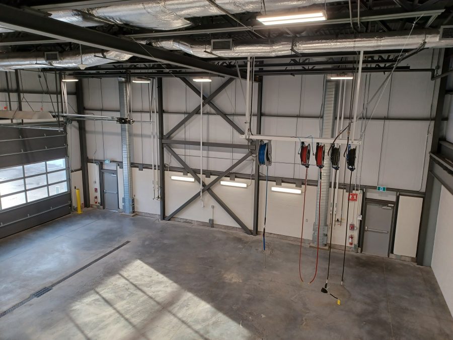 According to Director of Public Works Jonathan Wilson, the new garage has eight doors for four bays which allow trucks and other equipment to be parked inside and pass through without reversing. There are also two separate garage bays for vehicle and equipment repair. The garage also contains a large, industrial air compressor, an industrial pressure washer, and a three-ton gantry hoist to lift vehicles and equipment.