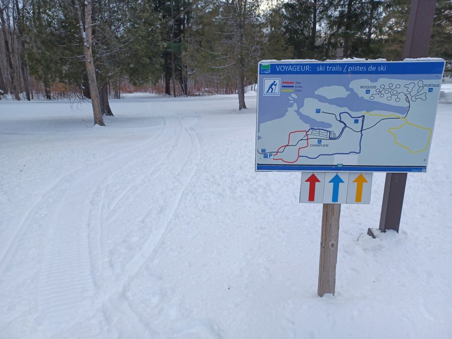 Groomed cross country ski trails and a plowed road for walking are offered at Voyageur Provincial Park near Chute-a-Blondeau. There are three ski trails of three, six, and 11 kilometres in length. The shortest loop is three kilometres. Access is from the park entrance on Front Road (County Road 4) near the Highway 417 interchange. Provincial park day use fees or seasonal/annual vehicle passes are required. The Champlain Public Library also loans Ontario Parks day use passes to library cardholders.