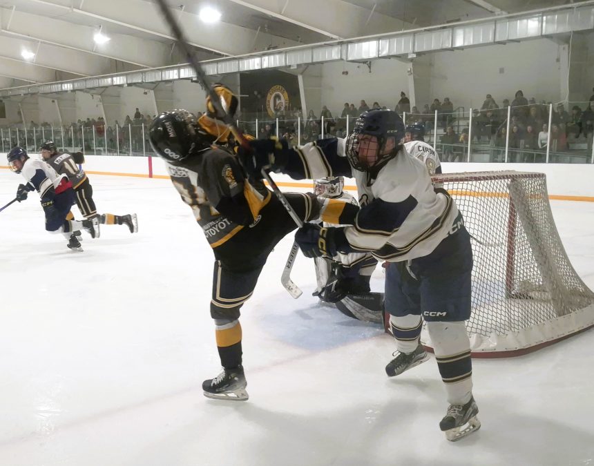Vankleek Hill’s Jacob Crete takes a hit during the Cougars’ 7-1 win over Kanata on Saturday, January 10. Photo: Reid Masson