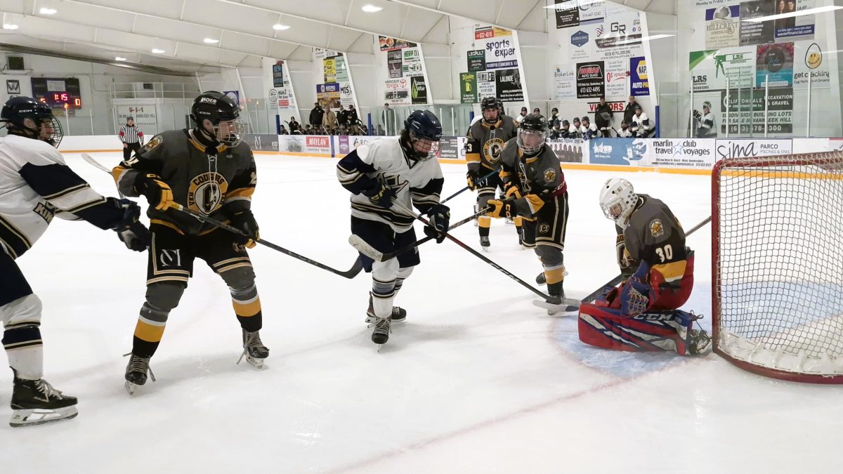 Cougars forward Nolan Macmillan (14) tries to slip the puck past Kanata Kings goalie Ronan O’Leary (33) during Vankleek Hill’s 7-1 win on Saturday, January 11. Photo: Reid Masson