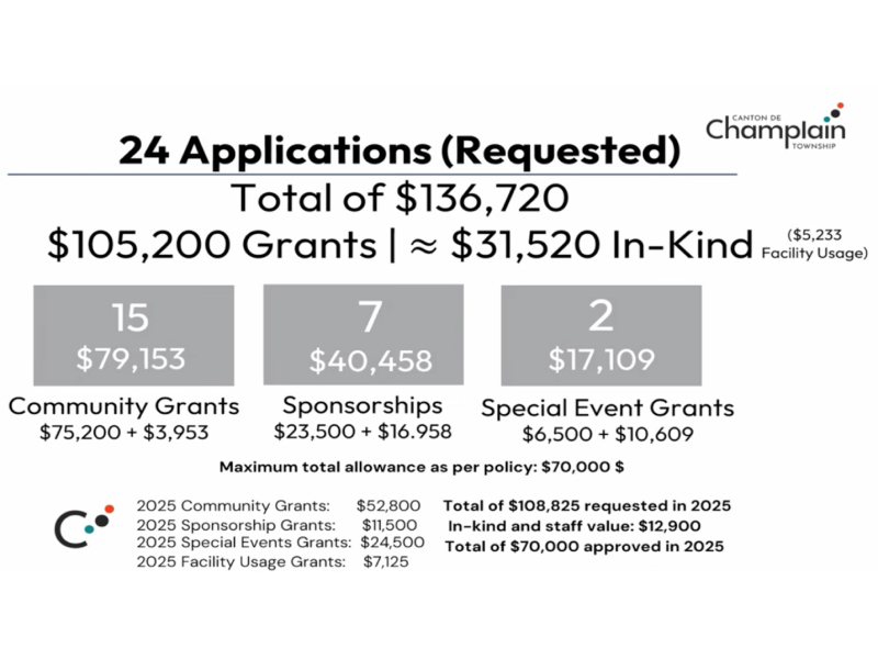 On Thursday, January 29, 2026, during its Committee of the Whole meeting, Champlain Township Council agreed upon a series of community grants and in-kind donations to local organizations. In total, $75,000 in grants will be awarded, surpassing the $70,000 initially approved for the year.