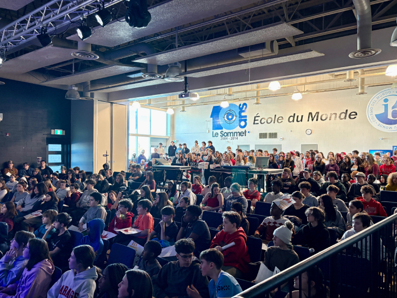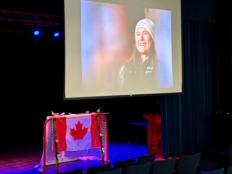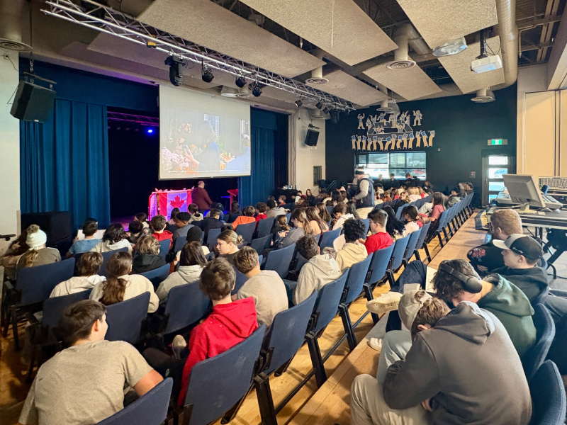 Dozens of students and staff were eager to cheer on Grenier in the school’s auditorium as she competed at the 2026 Winter Olympic Games. Students wore Team Canada gear, cheered, and waved posters as they watched one of her races on the projector.