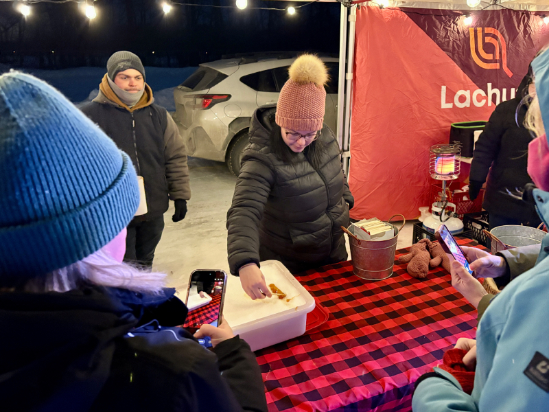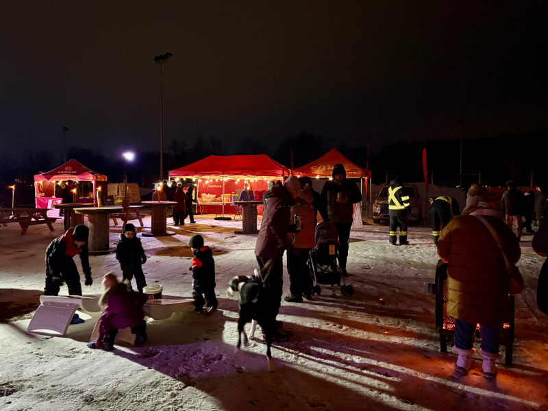 Maple taffy poured onto fresh snow, outdoor fireplaces for warmth, a selection of local brews and treats were available throughout the evening. Free hot chocolate and coffee, provided by municipal staff, helped ensure participants stayed warm during the wintery walk. Live music and cornhole games added to the festive atmosphere, with performances by Guillaume Asselin.