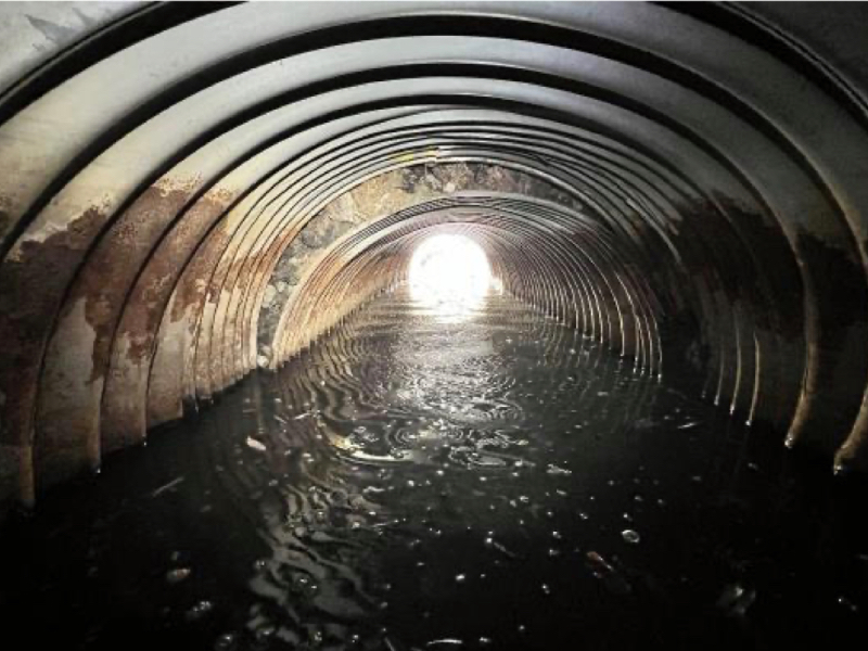 In 2024, EVB Engineering conducted a detailed assessment, finding the culvert in poor condition. Significant joint deformation in the corrugated steel pipe prevented relining, prompting a recommendation for full replacement within two years.