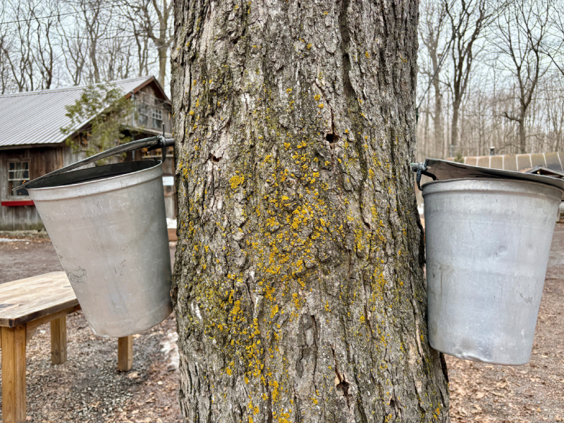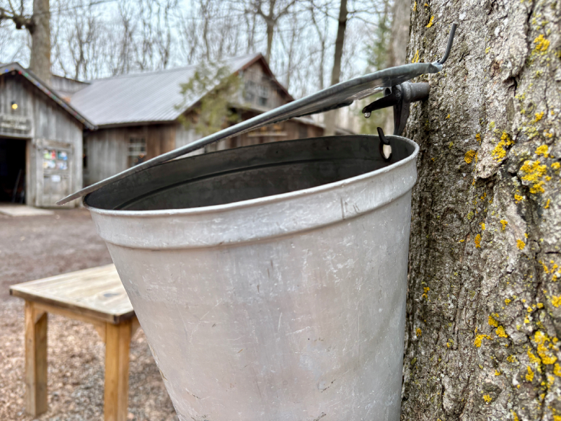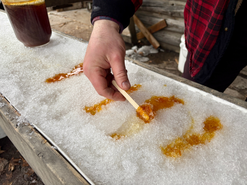 While modern maple producers often rely on plastic tubing systems, the farm continues to collect sap using approximately 2,000 buckets across its maple forest. The syrup is still produced using a wood-fired evaporator, and maple taffy is prepared over a wood stove.