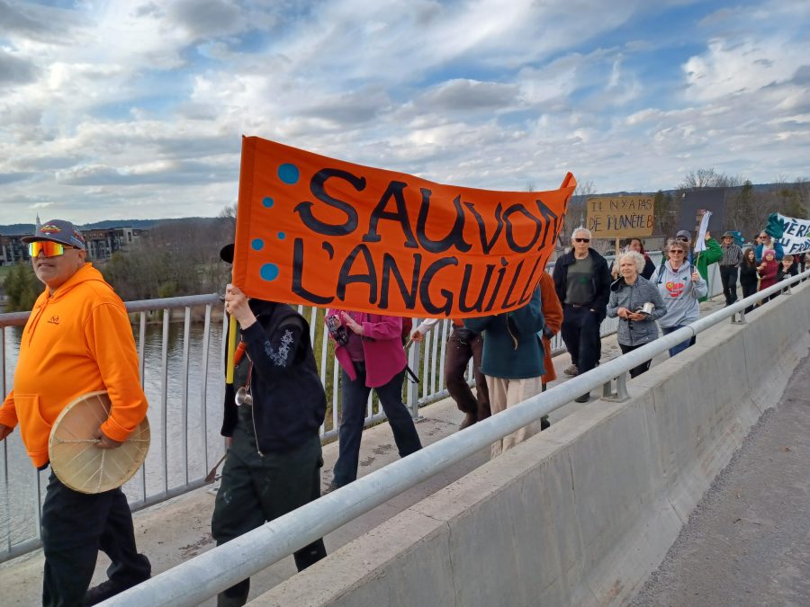Demonstrators of all ages carried signs and other objects and shouted slogans in support of environmental causes, including the protection of the Ottawa River and preserving the habitat for eels in the river. One of the objects they carried was indeed meant to resemble a large eel.