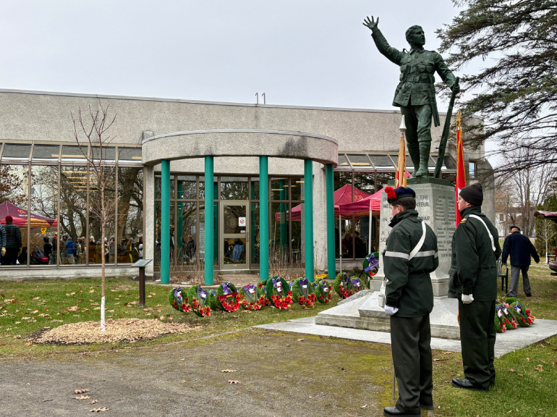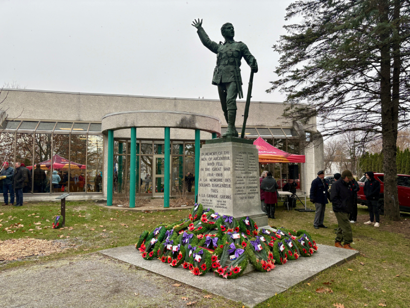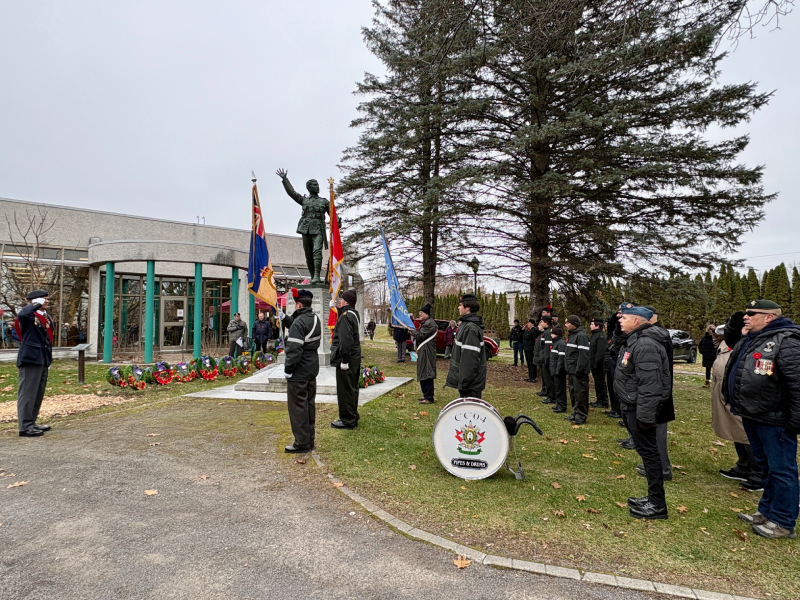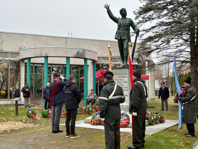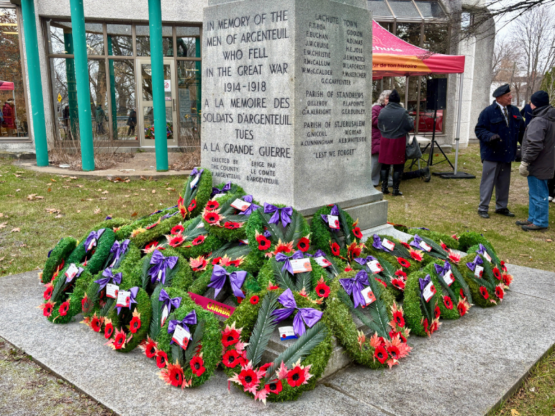 Several wreaths, donated by local organizations, businesses, and families, were placed at the base of the cenotaph, including one laid by Lachute Mayor Bernard Bigras-Denis on behalf of the city.