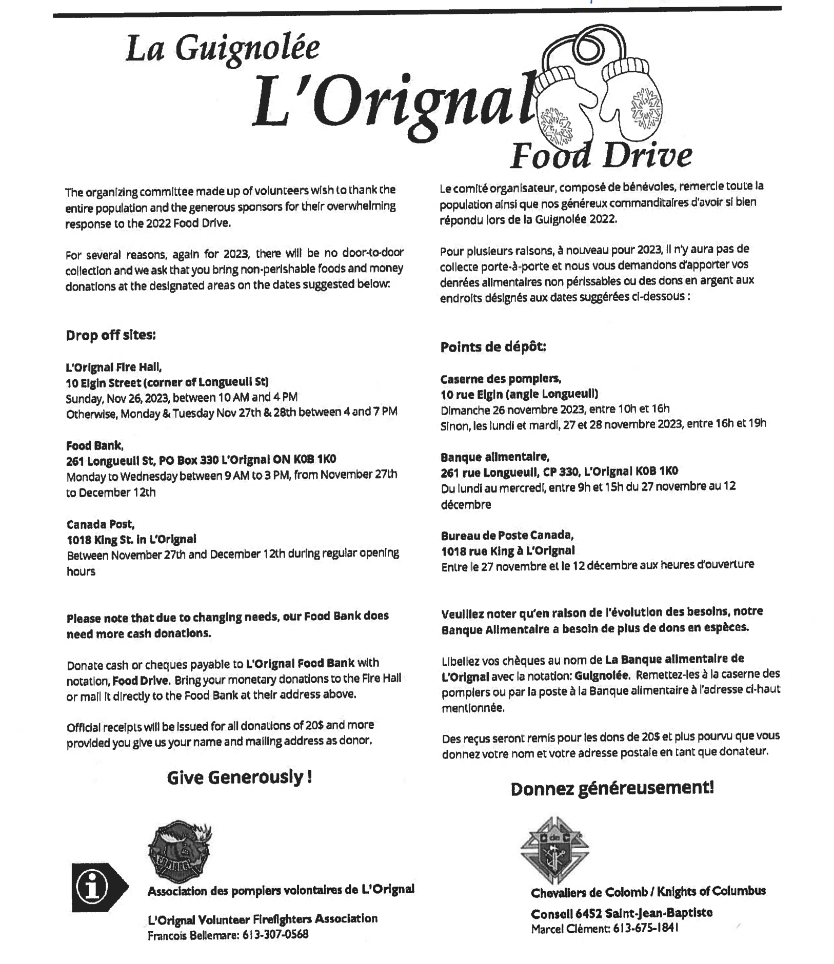Donate cash or cheques payable to L’Orignal Food Bank with notation Food Drive. Bring your monetary donations to the Fire Hall or mail it directly to the Food Bank at their address above.