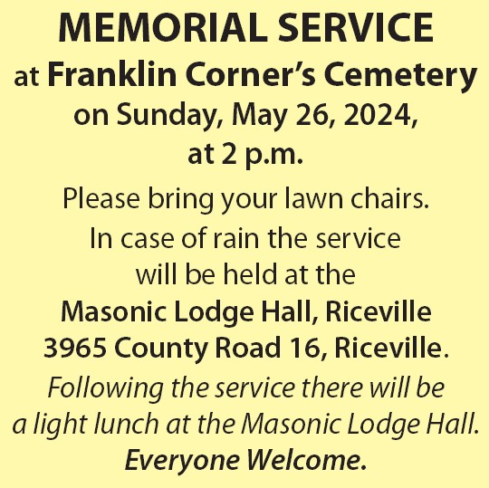 Please bring your lawn chairs. In case of rain the service will be held at the Masonic Lodge Hall, Riceville 3965 County Road 16, Riceville.