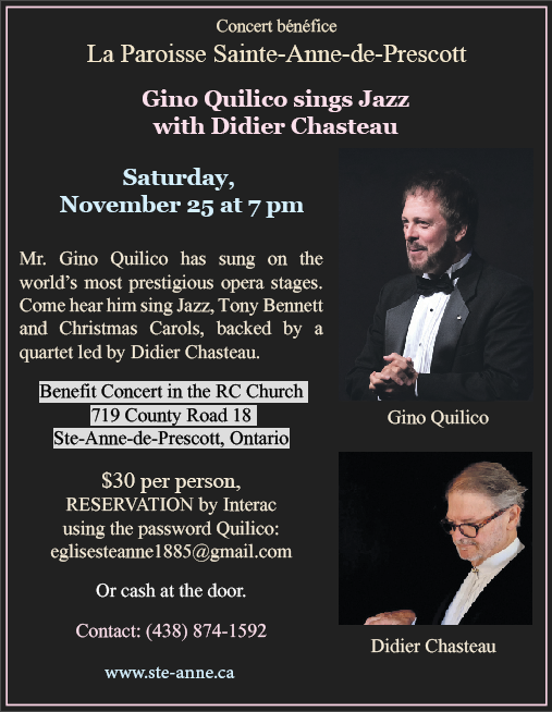 Mr. Gino Quilico has sung on the world’s most prestigious opera stages. Come hear him sing Jazz, Tony Bennett and Christmas Carols, backed by a quartet led by Didier Chasteau.