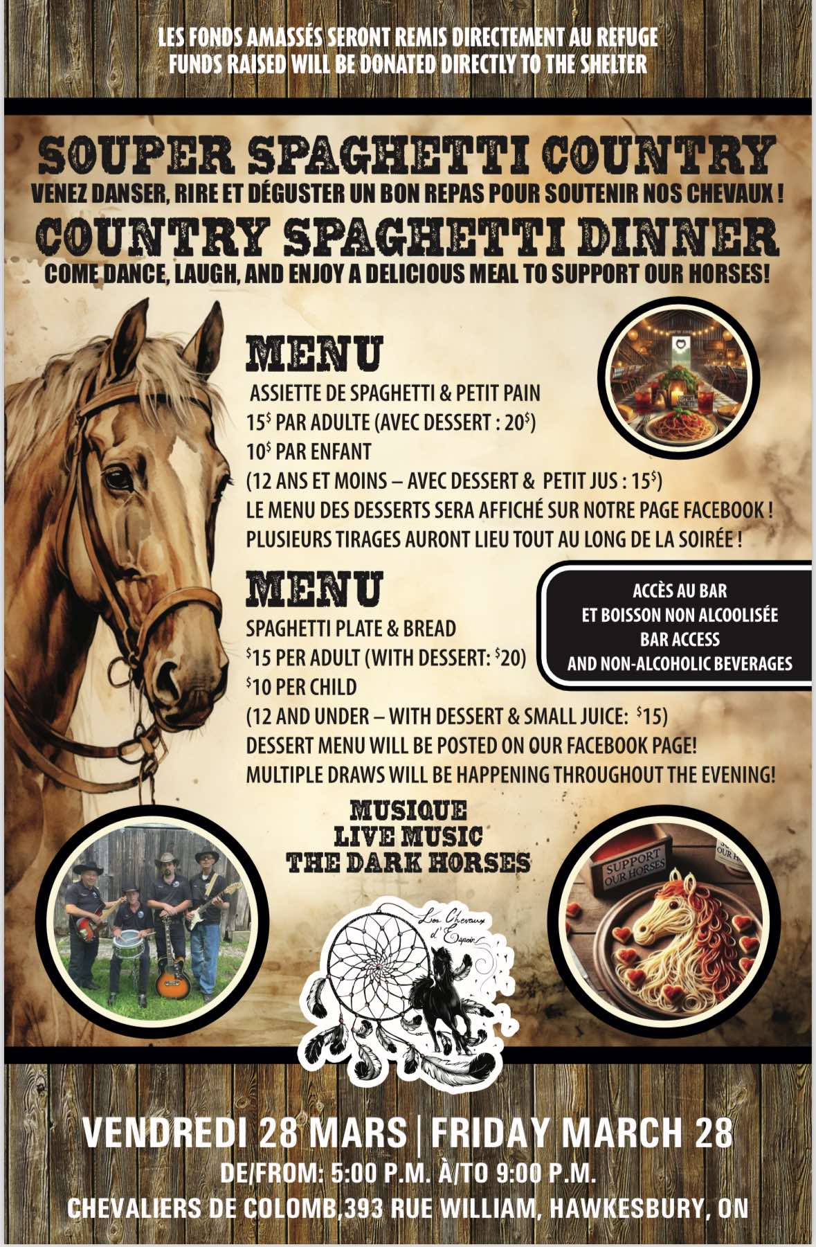 Come dance, laugh and enjoy a great meal to support our horses!