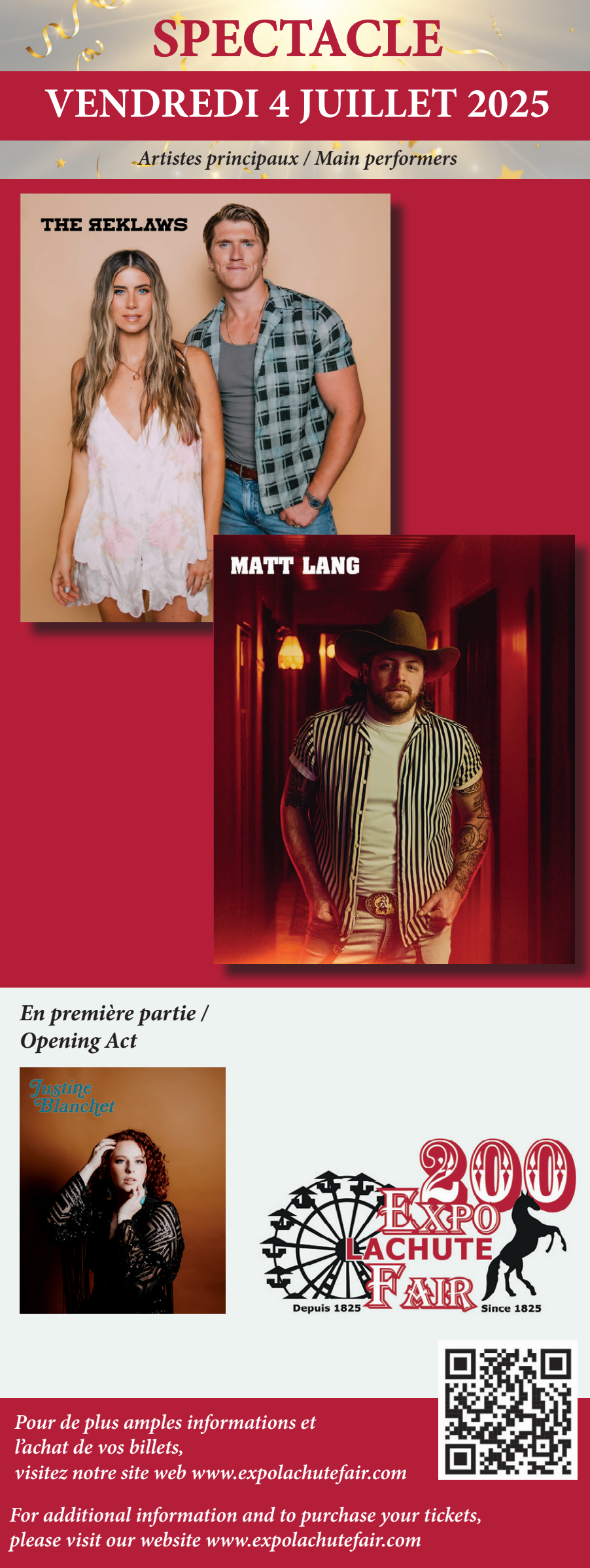 MAin performers: The Reklaws and Matt Lang. Opening act: Justine Blanchet For additional information and to purchase your tickets, please visit our website www.expolachutefair.com