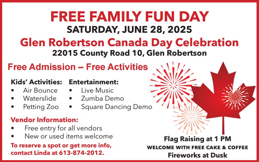 Free Admission – Free Activities Kids’ Activities: • Air Bounce • Waterslide • Petting Zoo Entertainment: • Live Music • Zumba Demo • Square Dancing Demo Flag Raising at 1 PM, welcome with free cake & coffee, Fireworks at Dusk Vendor Information: • Free entry for all vendors • New or used items welcome Glen […]