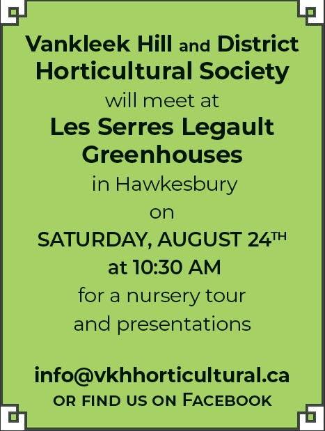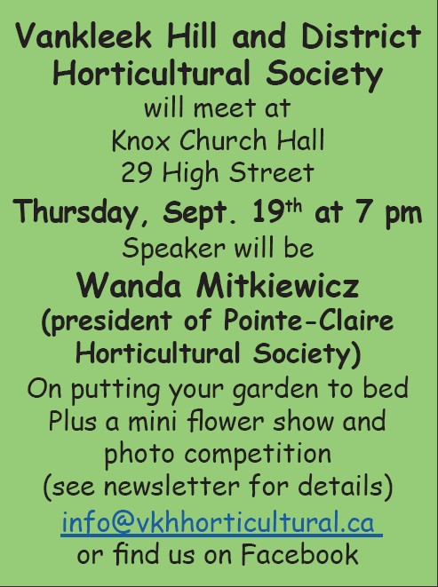 Vankleek Hill and District Horticultural Society will meet at Knox Church Hall 29 High Street Thursday, Sept. 19th at 7 pm Speaker will be Wanda Mitkiewicz (president of Pointe-Claire Horticultural […]