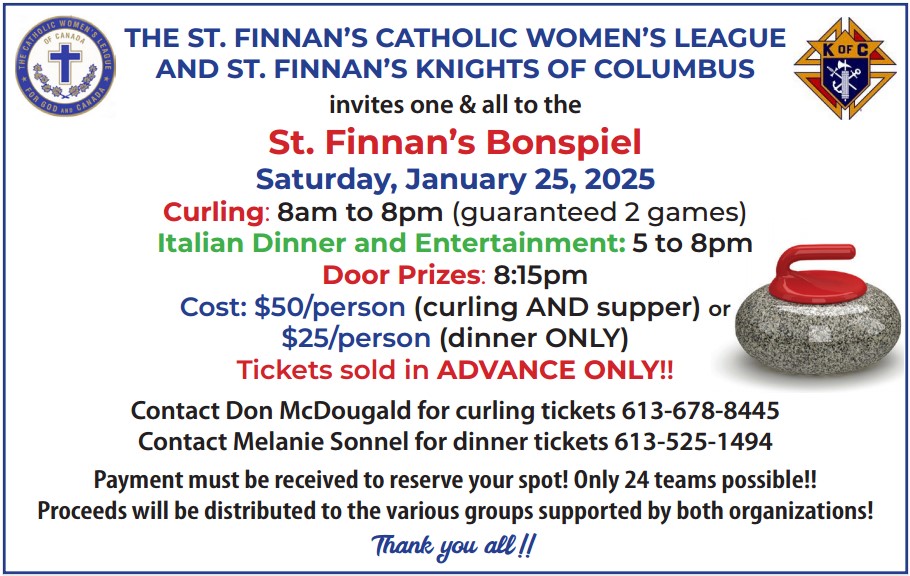 THE ST. FINNAN’S CATHOLIC WOMEN’S LEAGUE AND ST. FINNAN’S KNIGHTS OF COLUMBUS Curling: 8am to 8pm (guaranteed 2 games) Italian Dinner and Entertainment: 5 to 8pm Door Prizes: 8:15pm Cost: $50/person (curling AND supper) or $25/person (dinner ONLY) Tickets sold in ADVANCE ONLY!! Contact Don McDougald for curling tickets 613-678-8445 Contact Melanie Sonnel for dinner […]