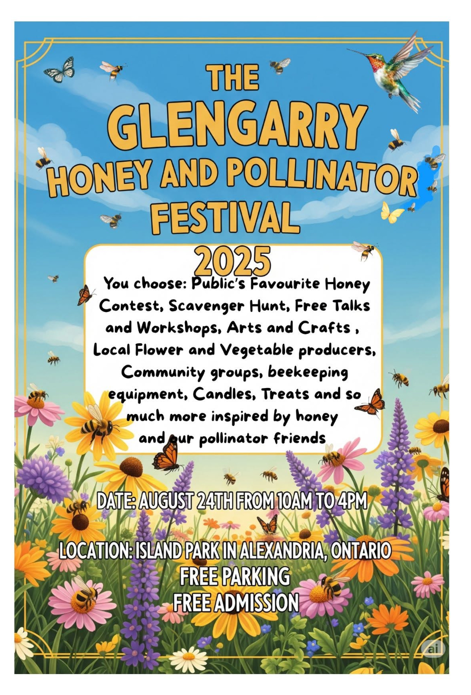 Glengarry Honey and Pollinator's Festival August 24 - 10 am to 4 pm Alexandria Island Park, 102 Derby St W, North Glengarry, Ontario, K0C 1A0 Meet the vendors TIBO Honey Stewart Honey Gees Bees Hillside Apiaries McCaig Honey Hazelwood Gardens Twin Oaks Elementary School Buzz Honey Products Raising River Conservation Alus South Nation Conservation Vankleek […]