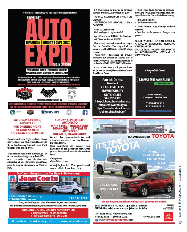 SATURDAY EVENING, AUGUST 31 PRE-OPENING NIGHT 31 AOÛT SAMEDI SOIR AVANT OUVERTURE Downtown Cruise Night on Main Street, 6pm to 9pm. Live Music (Band Feelin’EZ). It’s a Hawkesbury Central Food […]