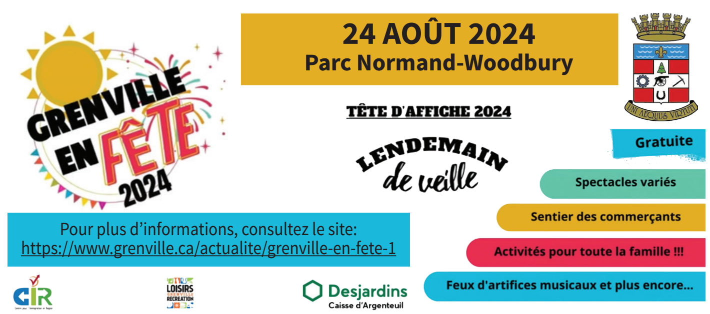 Pour plus d’informations, consultez le site: https://www.grenville.ca/actualite/grenville-en-fete-1 Gratuit, Spectacles variés, sentier des commerçants, activités pour toute la famille, feux d'artifices musicaux et plus encore Parc Nromand-Woodbury