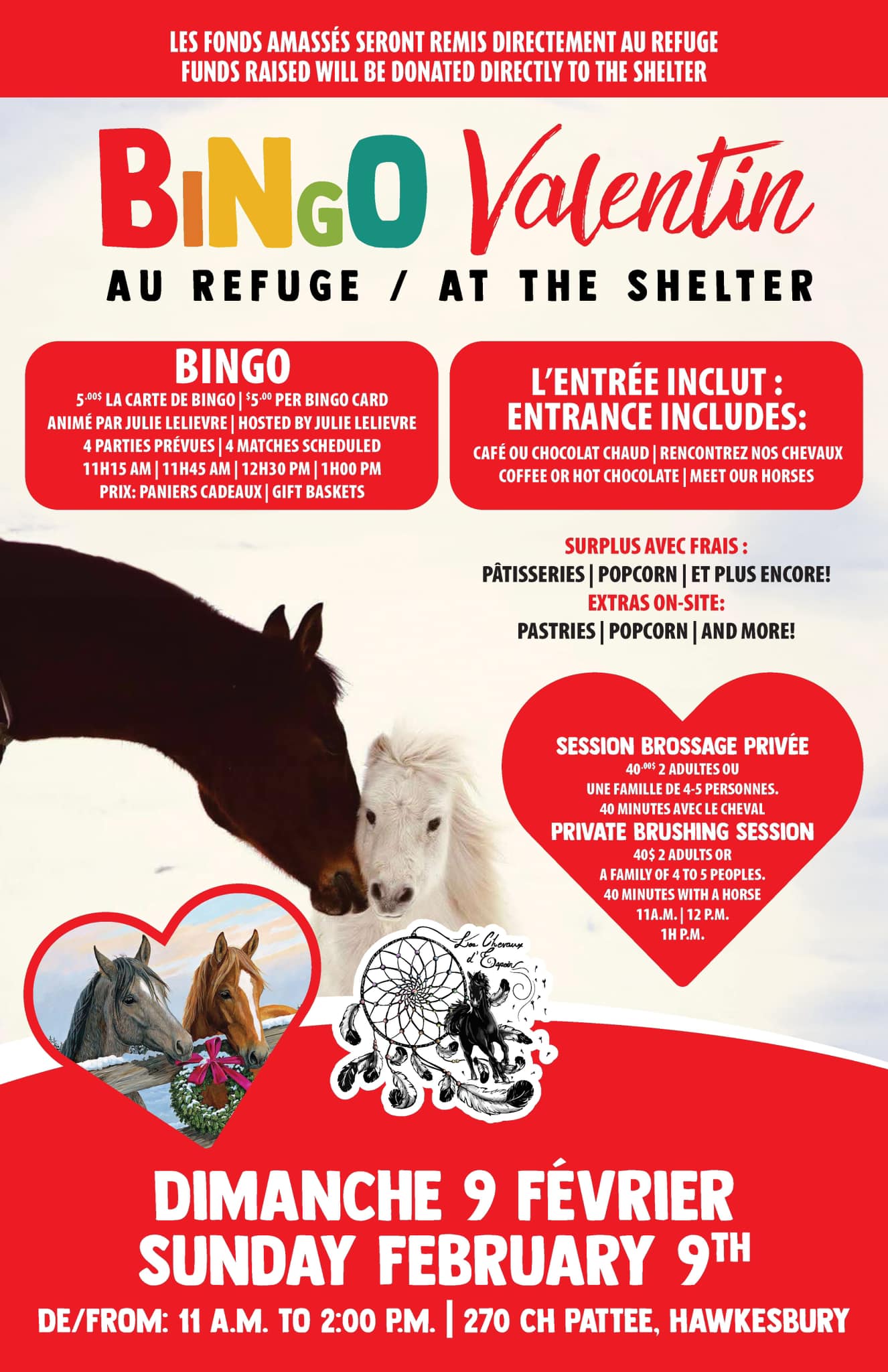 Valentine Bingo at the shelter Date: Sunday, February 9th, 2025 from 11 am to 2 pm Location: Horses of Hope Refuge, 270 Pattee Rd. Hawkesbury Special Activities: Bingo Admission: $5.00 per bingo card Game times: • 11:15 am • 11:45 am • 12:30 pm • 1:00 pm The entrance fee includes: • Coffee or hot […]