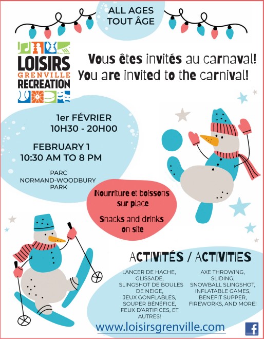 You are invited the the carnival! All ages! Located at: NORMAND-WOODBURY PARK AXE THROWING, SLIDING, SNOWBALL SLINGSHOT, INFLATABLE GAMES, BENEFIT SUPPER, FIREWORKS, AND MORE! Snacks and drinks on site www.loisirsgrenville.com
