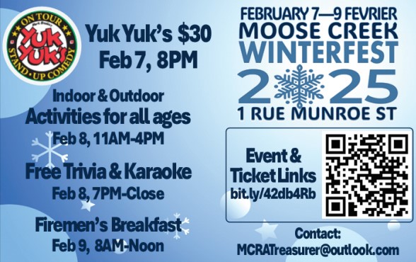 FEBRUARY 7, 2025 ~ 8 PM, MOOSE CREEK’S 2025 WINTERFEST YUK YUK’S SHOW 1 Munro St., Moose Creek, ON Doors will be open at 7 PM For ticket options visit: https://www.facebook.com/ events/1177027110750861 Lineup: CEDRIC NEWMAN, CHRIS QUIGLEY, and DAN ALLAIRE. Bar and canteen. This event is for ages 19+ only. This is a licensed event […]