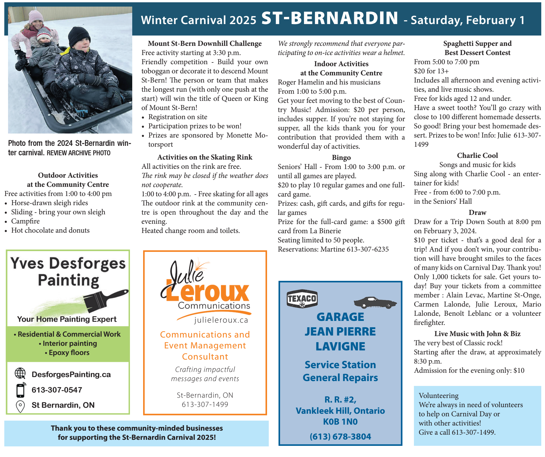 Outdoor Activites at the Community Centre Free activities from 1:00 to 4:00 pm • Horse-drawn sleigh rides • Sliding - bring your own sleigh • Campfire • Hot chocolate and donuts Mount St-Bern Downhill Challenge Free activity starting at 3:30 p.m. Friendly competition - Build your own toboggan or decorate it to descend Mount St-Bern! […]