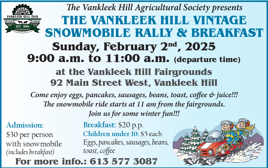 Come enjoy eggs, pancakes, sausages, beans, toast, coffee & juice!!! The snowmobile ride starts at 11 am from the fairgrounds. Join us for some winter fun!!! Presented by The Vankleek Hill Agricultural Society Admission: $30 per person with snowmobile (includes breakfast) Breakfast: $20 p.p. Children under 10: $5 each Eggs, pancakes, sausages, beans, toast, coffee […]