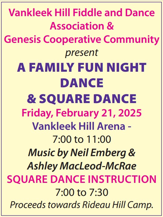 Vankleek Hill Fiddle and Dance Association & Genesis Cooperative Community present: A Family Fun Night Dance & Square Dance Music by Neil Emberg & Ashley MacLeod-McRae Square Dance Instruction 7:00 to 7:30 Proceeds towards Rideau Hill Camp.