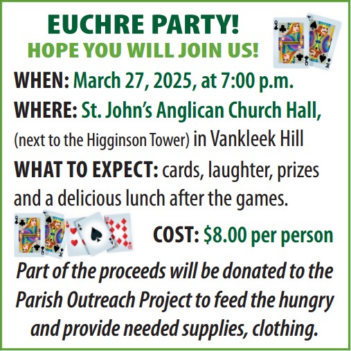 SUPPER 4:00 - 7:00 PM MUSIC 4:00 - 10:00 PM GILLES ENTERTAINMENT DJ / KARAOKE Local Musicians CASH BAR PAROISSE ST-MARTIN-DE TOURS PARISH 21947 Main St., Glen Robertson Prices Adults $20.00 Children (6-12): $10.00 Under 6: Free Without meal: $10.00 Menu Spaghetti with meat sauce, salad, bread, dessert, tea, coffee Andre Duran Caterer EAT • […]