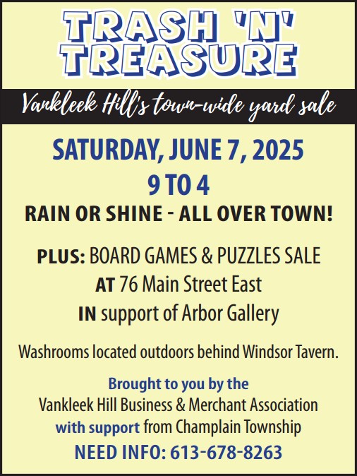 Vankleek Hill's popular town-wide yard sale takes place on Saturday, June 7 from 9 am to 4 pm! Get ready to haggle!