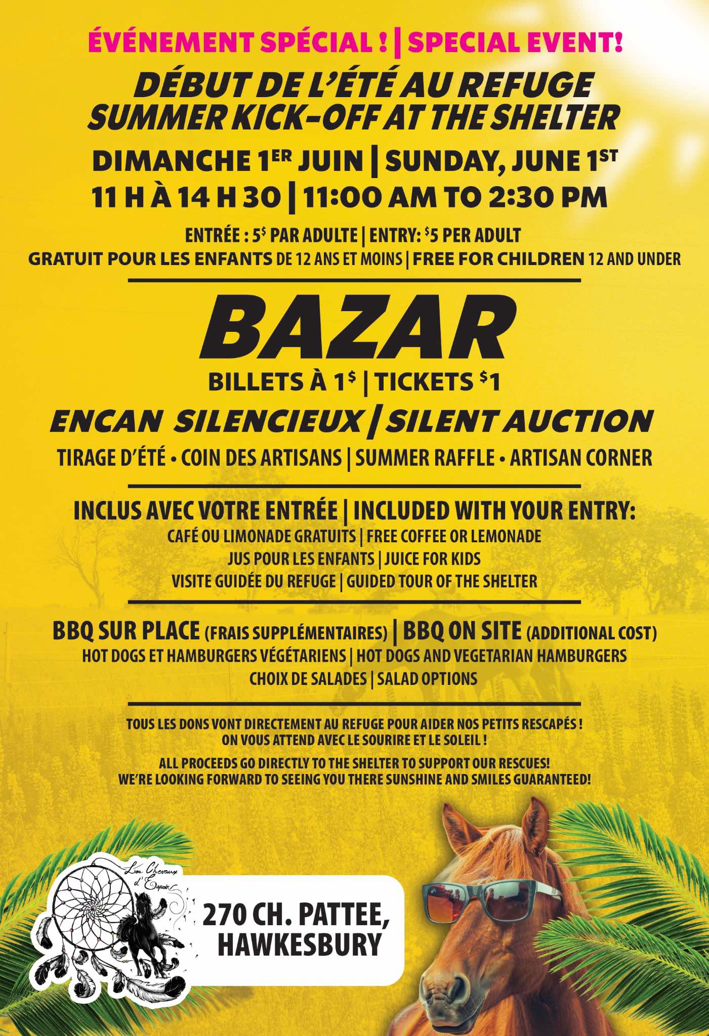 Refuge - Les Chevaux D'Espoir Special event - Summer kick-off at the shelter 270 Pattee Rd. Hawkesbury Sunday, June 1st, 2025 From 11:00 am to 2:30 pm Entry: $5 per adult Free for children aged 12 and under On the agenda: Bazaar — $1 Tickets Artisan's Corner Silent auction Included with your entry: Free coffee […]