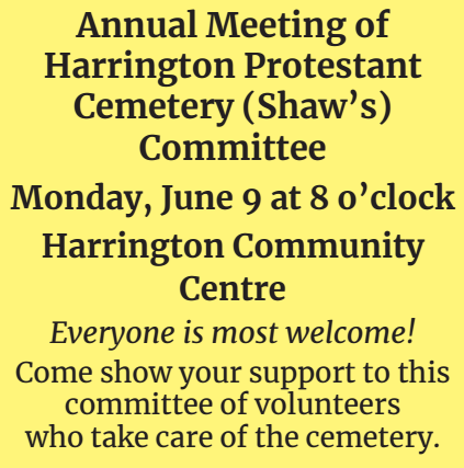 Annual Meeting of Harrington Protestant Cemetery (Shaw’s) Committee Everyone is most welcome! Come show your support to this committee of volunteers who take care of the cemetery. |