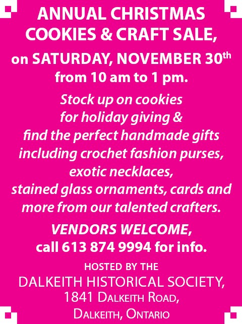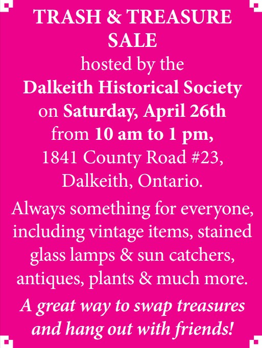 The Dalkeith Historical Society is having their Annual General Meeting on Saturday, May 28th at 10 a.m. at 1841 County Road 23, Dalkeith Everyone is welcome. Stay for coffee and conversation. For info: 613 874 9994