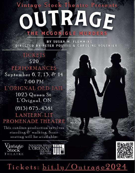 Vintage Stock Theatre Presents: Outrage, The McGonigle Murders by Susan M. Flemming Directed by Peter Politis & Caroline Routhier Tickets $20 Performances: September 6, 7, 13, and 14 Lantern lit promenade theatre This outdoor production involves standing and walking. Some seating will be available.