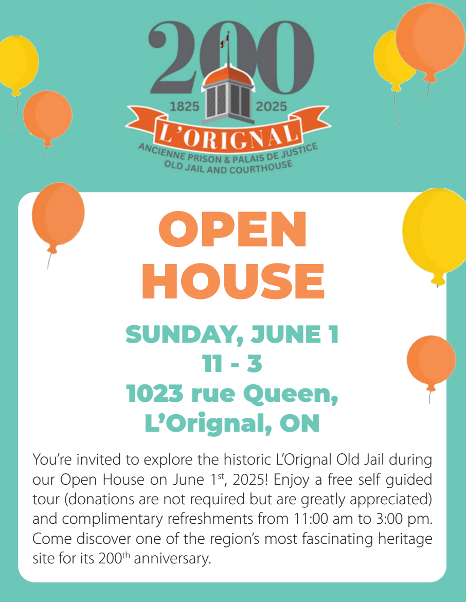 You’re invited to explore the historic L’Orignal Old Jail during our Open House on June 1st, 2025! Enjoy a free self guided tour (donations are not required but are greatly appreciated) and complimentary refreshments from 11:00 am to 3:00 pm. Come discover one of the region’s most fascinating heritage site for its 200th anniversary.