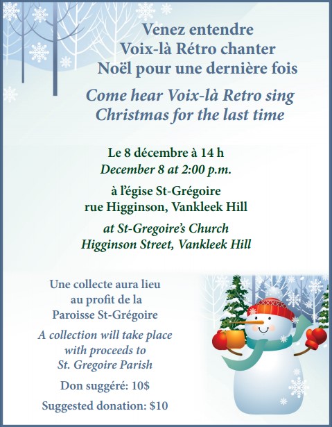 Venez entendre Voix-là Rétro chanter Noël pour une dernière fois / Come hear Voix-là Retro sing Christmas for the last time Une collecte aura lieu au profit de la Paroisse St-Grégoire /A collection will take place with proceeds to St. Gregoire Parish Don suggéré: 10$ / Suggested donation: $10