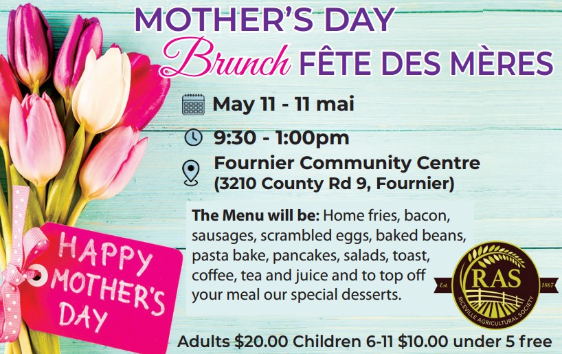 The Menu will be: Home fries, bacon, sausages, scrambled eggs, baked beans, pasta bake, pancakes, salads, toast, coffee, tea and juice and to top off your meal our special desserts. Adults $20.00 Children 6-11 $10.00 under 5 free Brought to you by the Riceville Agricultural Society