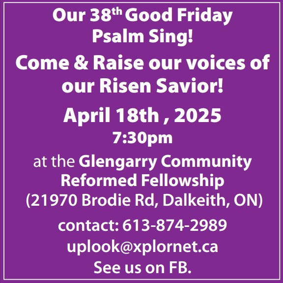 Good Friday Annual Psalm Sing! Friday, April 19 at 7:30 p.m. at the Lochiel Reformed Presbyterian Church 21970 Brodie Rd., E., Dalkeith, ON For more info: 613-874-2989 or [email protected]