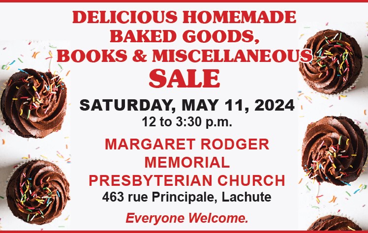 SPRING BAKE SALE & COFFEE HOUR will be held on May 4 from 10 am to 1 pm at Margaret Rodger Memorial Presbyterian Church, 463 rue Principale, Lachute Plants, books, trinkets and treasures will also be for sale. Everyone welcome.