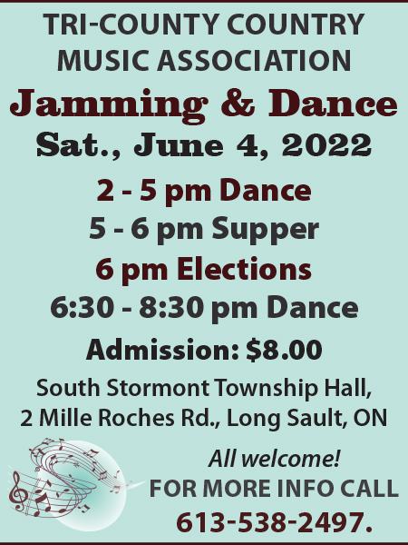 FeaturedSouth Stormont Township Hall 2 Mille Roches Rd, Long Sault, OntarioTRI-COUNTY COUNTRY MUSIC ASSOCIATION Jamming & Dance Saturday May 7, 2022 2-5 pm Dancing 5-6:30 pm Supper 6:30 - 8:30 pm Dancing Admission $8 Supper $10 Evening Dance Only $4 South Stormont Township Hall 2 Mille Roches Rd., Long Sault, ON For more info call 613-538-2497 All Welcome!