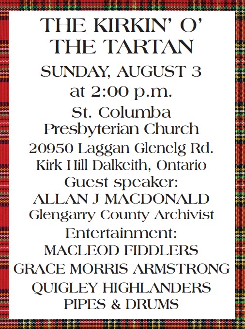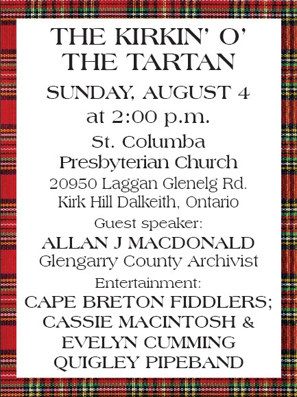 KIRKIN O’ THE TARTAN St. Columba’s Presbyterian Church Laggan Glenelg Rd. Kirk Hill Dalkeith, Ontario at 2:00 pm Everyone Welcome Info: 613 525-2942 Sunday, Aug. 4