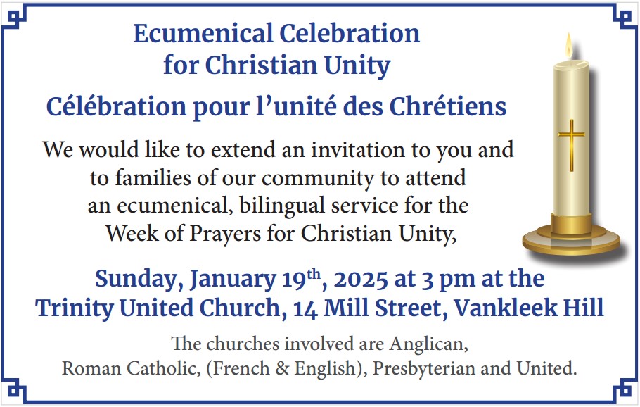 We would like to extend an invitation to you and to families of our community to attend an ecumenical, bilingual service for the Week of Prayers for Christian Unity. The churches involved are Anglican, Roman Catholic, (French & English), Presbyterian and United.