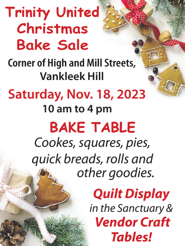 Corner of High and Mill Streets, Vankleek Hill. Cookies, squares, pies, quick breads, rolls and other goodies. Quilt Display in the sanctuary and vendor craft tables.