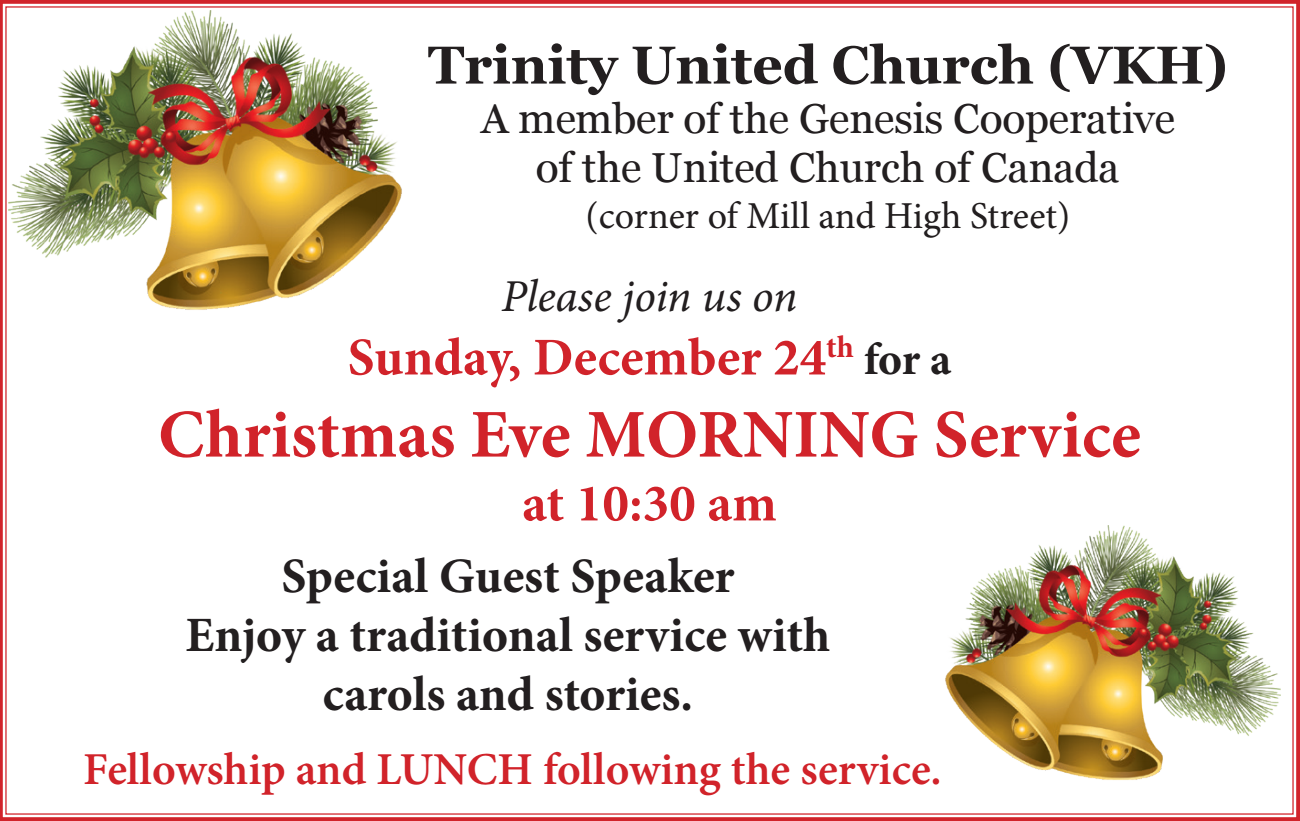Please join us on Sunday, December 24th for a Christmas Eve MORNING Service at 10:30 amSpecial Guest Speaker Enjoy a traditional service with carols and stories. Fellowship and LUNCH following the service.