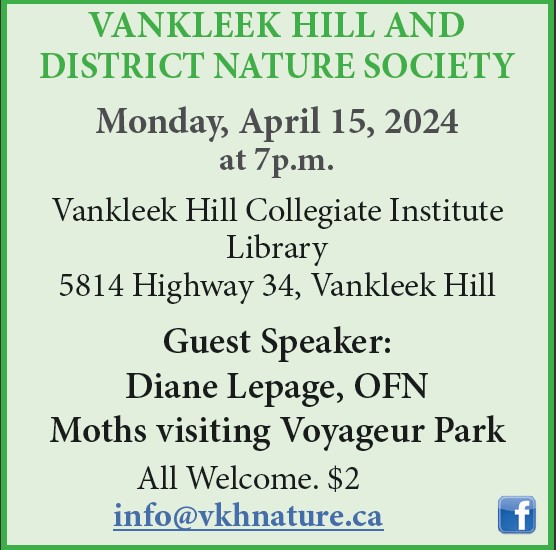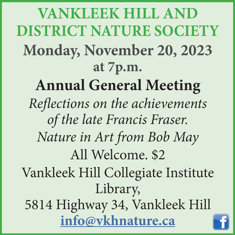 Vankleek Hill and District Nature Society Annual General Meeting. Reflections on the achievements of the late Francis Fraser. Nature in Art from Bob May. All welcome. $2. Vankleek Hill Collegiate Institute Library.